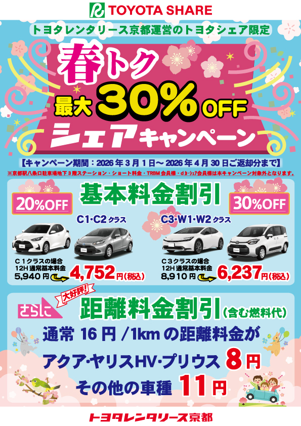 トヨタレンタリース京都では2026年3月1日(日)~2026年4月30日(木)ご返却分まで京都府内トヨタレンタリース京都の運営する全ステーション*にて「春トク最大30%offシェアキャンペーン」を開催いたします!