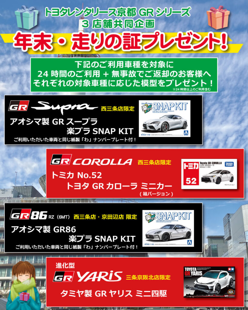 トヨタレンタリース京都では、12/1〜12/31の期間限定で 「年末・走りの証プレゼント」キャンペーンを開催