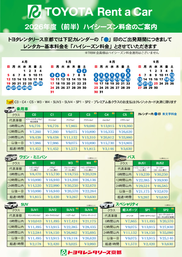 お知らせ ハイシーズン料金のご案内(2026年4月・5月・8月・9月) 2026.03.27 お知らせ重要なお知らせ トヨタレンタリース京都では下記期間のご出発につきまして、レンタカー基本料金を「ハイシーズン料金」とさせていただきます。(Vクラス・Tクラスにつきましてはハイシーズン料金対象外となります) ハイシーズン期間: 2026年 4月・5月・8月・9月の指定日 ハイシーズン基本料金につきましては下記料金表をご参照ください 前の記事 一覧に戻る お知らせ 2026.02.16 お知らせ 2026年ハイシーズン(4/24~5/5)料金のご案内 2026.02.12 お知らせ 西村 勇 お別れの会について 2026.02.06 お知らせ トヨタシェア 北野白梅町駅前ステーション2026年2月6日 NEW OPEN 2025.12.03 お知らせ トヨタレンタリース京都スタッドレスタイヤオプション料金のご案内