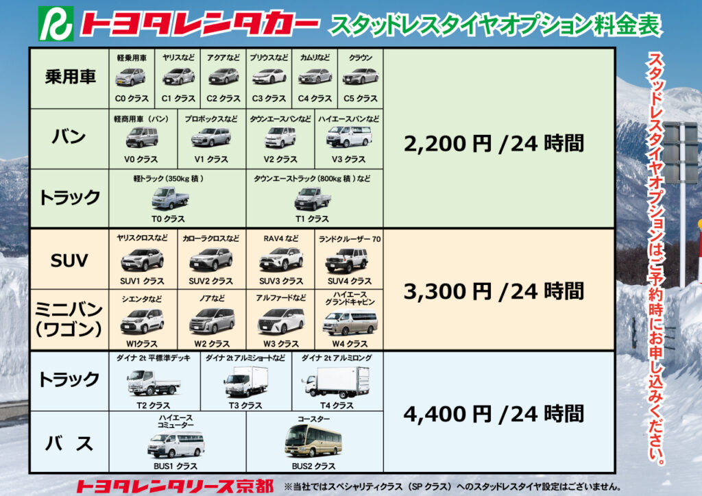 ※ トヨタレンタリース京都のスペシャリティクラス(SPクラス)にはスタッドレスタイヤは装着しておりません。